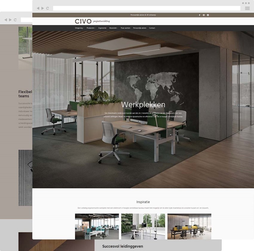 Dankzij de ondersteuning van Civo Projectinrichting ervaar jij rust bij het inrichten van jouw project. De combinatie van die rust en professionaliteit van Civo Projectinrichting zie je nu ook terug in de online omgeving. Via de gestructureerde navigatie kies je voor inspiratie gericht op omgeving of gericht op product. Je leest er meer over de aandachtspunten voor een goede ergonomie, over de details van een fijne akoestiek en over het optimaal inrichten van een thuiswerkplek. En als je benieuwd bent naar de mogelijkheden voor een specifieke ruimte, dan vraag je via de website een persoonlijk advies en 3D ontwerp aan. Met de aangepaste huisstijl, kleurstelling in aardetinten en strakke vormgeving, is de eigentijdse presentatie van Civo Projectinrichting compleet.