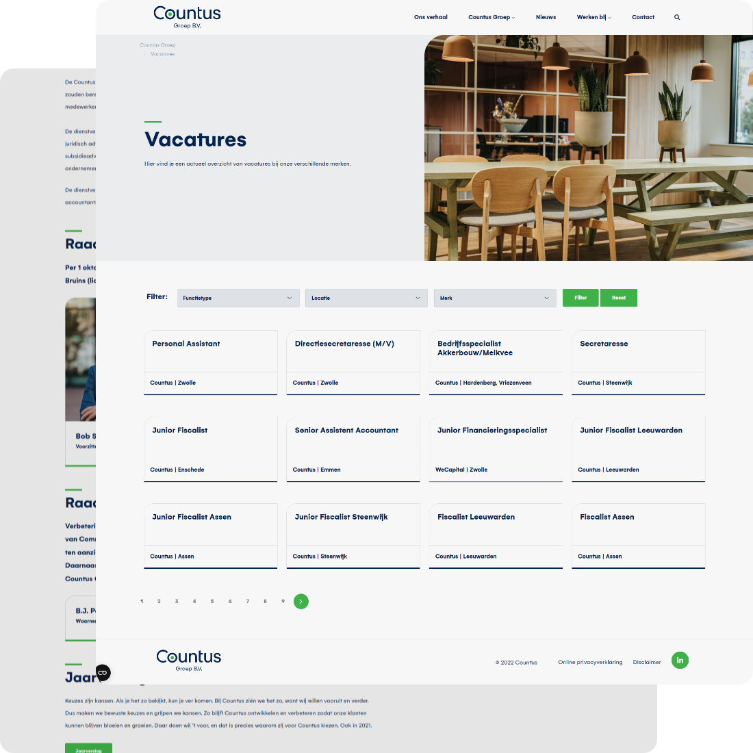 Extra aandacht is dan ook uitgegaan naar de Werken bij pagina en de vacaturebank. Laatstgenoemde is een dynamische plek geworden waar, middels een API koppeling, automatisch vacatures van Countus A+A ingeladen worden. Ook de vacatures van Subvention, Zienergie, WeCapital, WeRecover, De Omgevingadviseurs en Spoar worden hier centraal verzameld en doorgelinkt naar de desbetreffende websites. Filtering gebeurt op functietype, locatie en merk – een verzameling aan data die bekend is bij en gekoppeld is aan de verschillende dochterbedrijven.