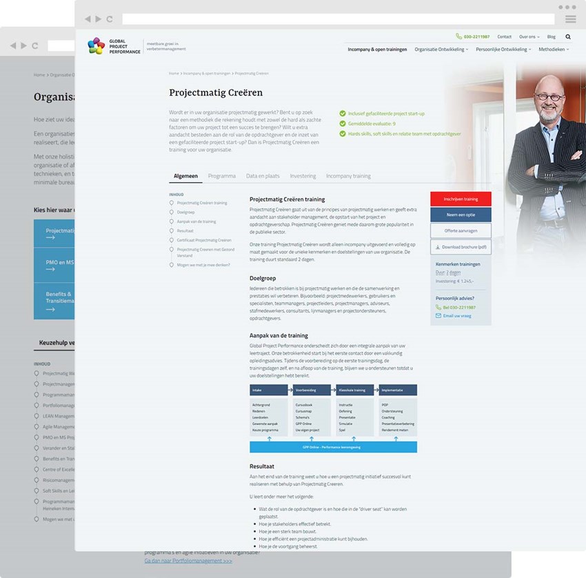 Global Project Performance biedt meer dan honderd verschillende trainingen aan op hun website. Om de bezoekers naar de juiste trainingspagina te leiden zonder al te lang te hoeven zoeken hebben we een soort wegwijzer aan de homepage toegevoegd.