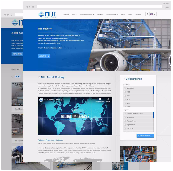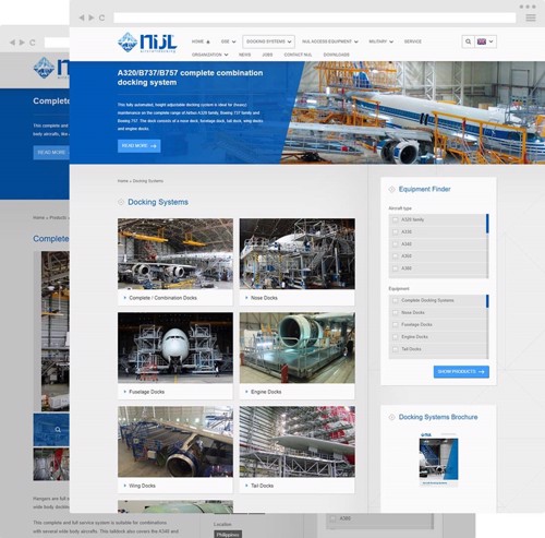 Vanuit alle werelddelen wordt de website bekeken. Zaak dus om op een intuïtieve manier de internationale bezoekers uit te laten komen bij wat ze zoeken. Hiervoor is door ons, in nauwe samenwerking met NIJL Aircraftdocking, de equipmentfinder ingericht. Hiermee kan op vliegtuigtype, bijvoorbeeld Airbus A320 of een Boeing 767, het juiste docking materiaal worden gekozen.