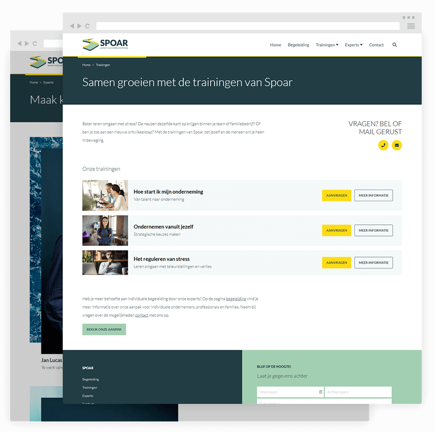 Het gezicht achter een bedrijf is erg belangrijk. Door deze duidelijk op de website naar voren te laten komen oogt het persoonlijker. De experts van Spoar staan daarom ook prominent op de website weergegeven. Om de gebruiker betrokken te houden is op elke pagina een mogelijkheid tot het inschrijven voor de nieuwsbrief toegevoegd.