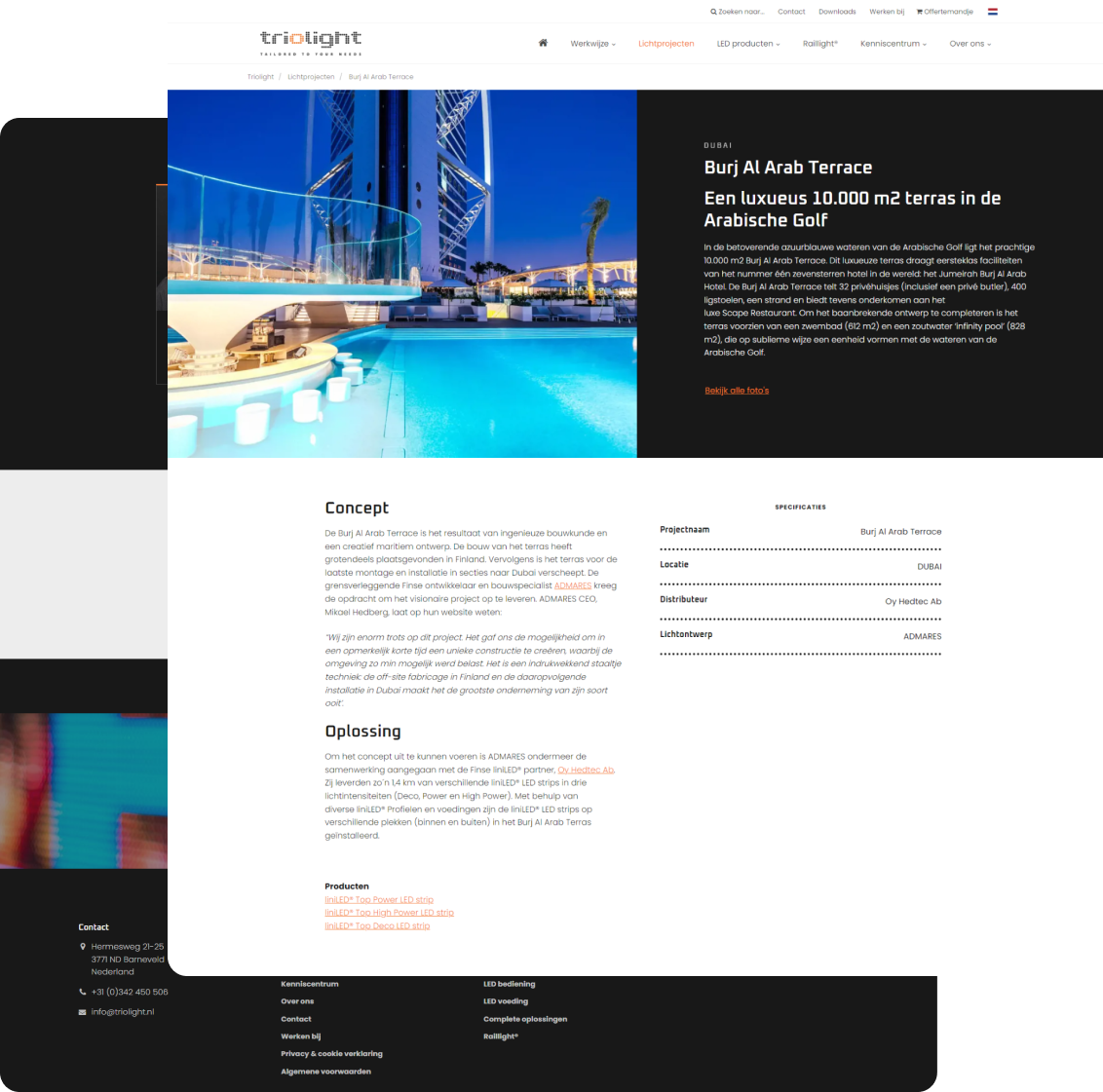 Voor het maken van het design hebben we het logo als uitgangspunt genomen. De oranje kleur, de hoekige vorm van het lettertype.. Kleine elementen waar we mee gespeeld hebben. De website hebben we vervolgens zo clean mogelijk in elkaar gezet, zodat bezoekers een rustige website onder ogen krijgen. Projecten hebben een prominente plek gekregen. Triolight werkt namelijk aan projecten over de hele wereld en dit is iets wat ze graag goed wilden uitlichten. Foto’s van projecten komen dan ook terug door de hele site en er is een pagina gemaakt speciaal voor alle projecten.
